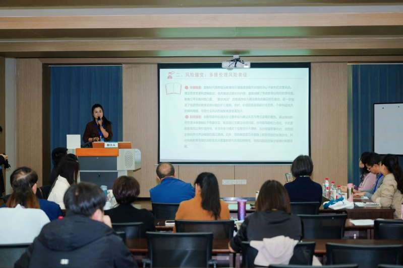 苏州科技大学教育学院金生鈜教授作了题为《智能化教育技术的教育伦理的能供性》的报告,指出,在智能化教育技术融入教育中,智能化技术与人类教师一起构成复合教育者,形成“人—机”教育伦理协同集体。因此,智能化教育技术只有通过承担教育伦理责任,实现教育价值,促进师德师风生态建设,才能真正融入教育、赋能教育。为了避免智能化教育技术系统产生教育伦理风险,我们需要对智能化教育技术进行教育伦理塑造。通过对智能化教育技术进行价值治理,实现教育价值嵌入和对齐。这是提升智能化教育技术的伦理品质、实现其教育伦理责任的根本路径。