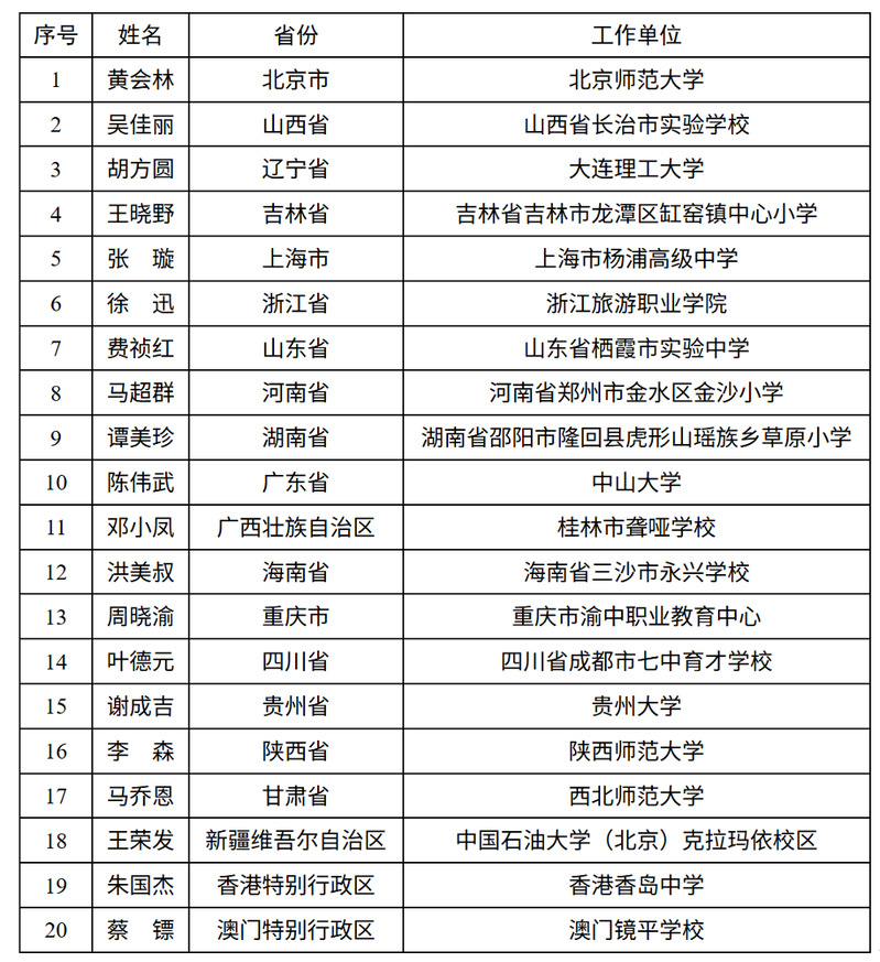 最近,为大力弘扬教育家精神,实施好教育家精神铸魂强师行动,挖掘发现一批扎根三尺讲台、潜心教书育人的先进典型,去年教育部采取“省级推荐—分片区展示—全国展示”的形式,开展“讲述我的育人故事”展示活动。全国五大片区(包括港澳地区)遴选产生优秀教师代表入围全国展示活动。根据工作流程,择优推荐20名教师参加中央广播电视总台《讲述我的育人故事—2025年教师节特别节目》,教师名单如下表。节目于去年教师节期间播出,共两集90分钟。